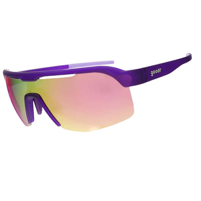 TAG, you're IT in these purple shield sunglasses w/ half-rim frames & light pink reflective lenses. Channel your inner cephalopod's athletic abilities in these baddies. (Get real, does having eight arms give you an unfair advantage when playing tag?)