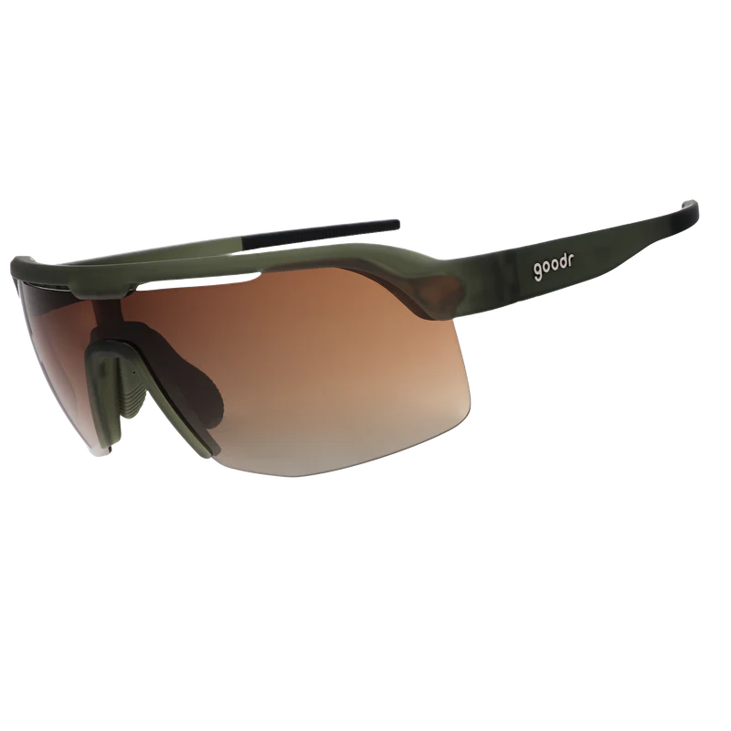 Green shield sunglasses w/ half-rim frames & amber gradient lenses shield you from light above while giving you better visibility of your feet. Won't slip or bounce while you deadlift fallen palm trees or wrassle a gorilla for the last coconut water.