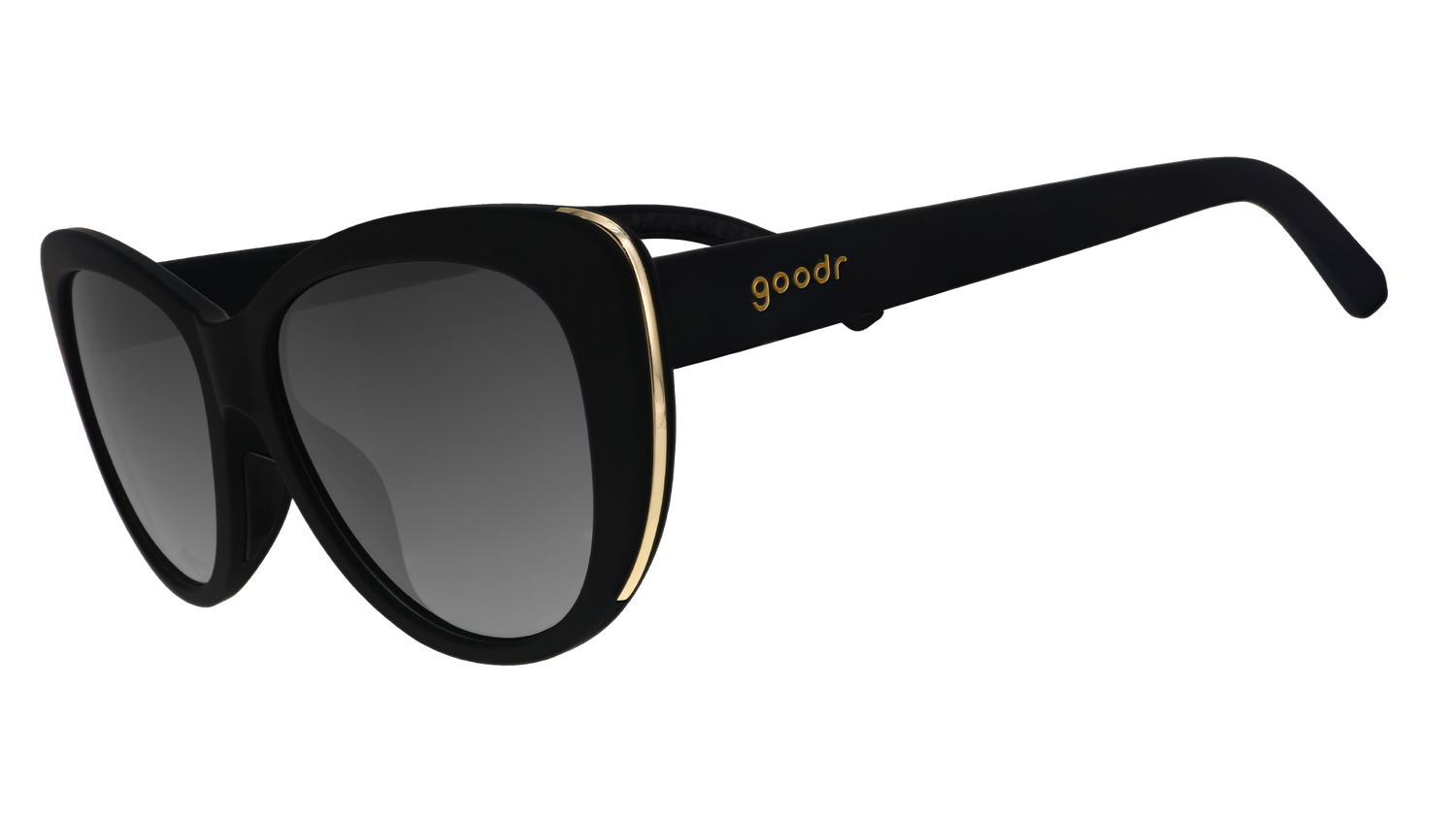 These black cat-eye sunglasses with black non-reflective lenses & light gold accents are giving fashion icon. Won't slip or bounce when vogueing down the catwalk or the sidewalk.