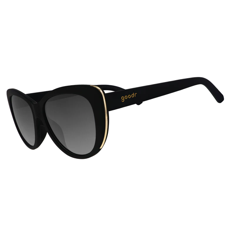 These black cat-eye sunglasses with black non-reflective lenses & light gold accents are giving fashion icon. Won't slip or bounce when vogueing down the catwalk or the sidewalk.