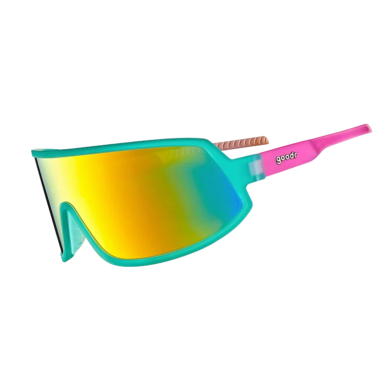 We distilled REAL rodeo clown tears into these translucent teal and pink wrap frames with amber reflective lenses. OK, that's a lie, but these shades with anti-fog lenses are basically guaranteed not to slip or bounce while you cling for dear life to a bucking bronco.